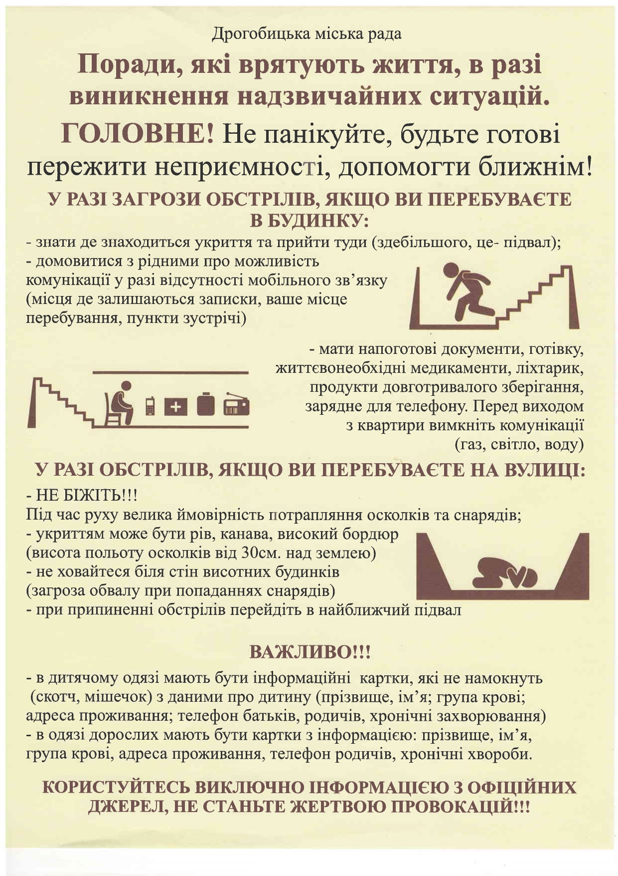 - Для укриття населення Дрогобича від надзвичайних ситуацій техногенного, природного та воєнного характеру створено фонд захисних споруд цивільного захисту. Фонд включає сховища цивільного захисту, підвальні приміщення житлових будинків, споруди підземного простору, які можуть бути тимчасово використані для укриття населення. Керівники організацій та власники вищезгаданих споруд за необхідності забезпечать вільний доступ для укриття. Для зручності інформування населення Дрогобицька міська рада оновила мапу, де вказані адресні місця укриттів у підземному просторі”.