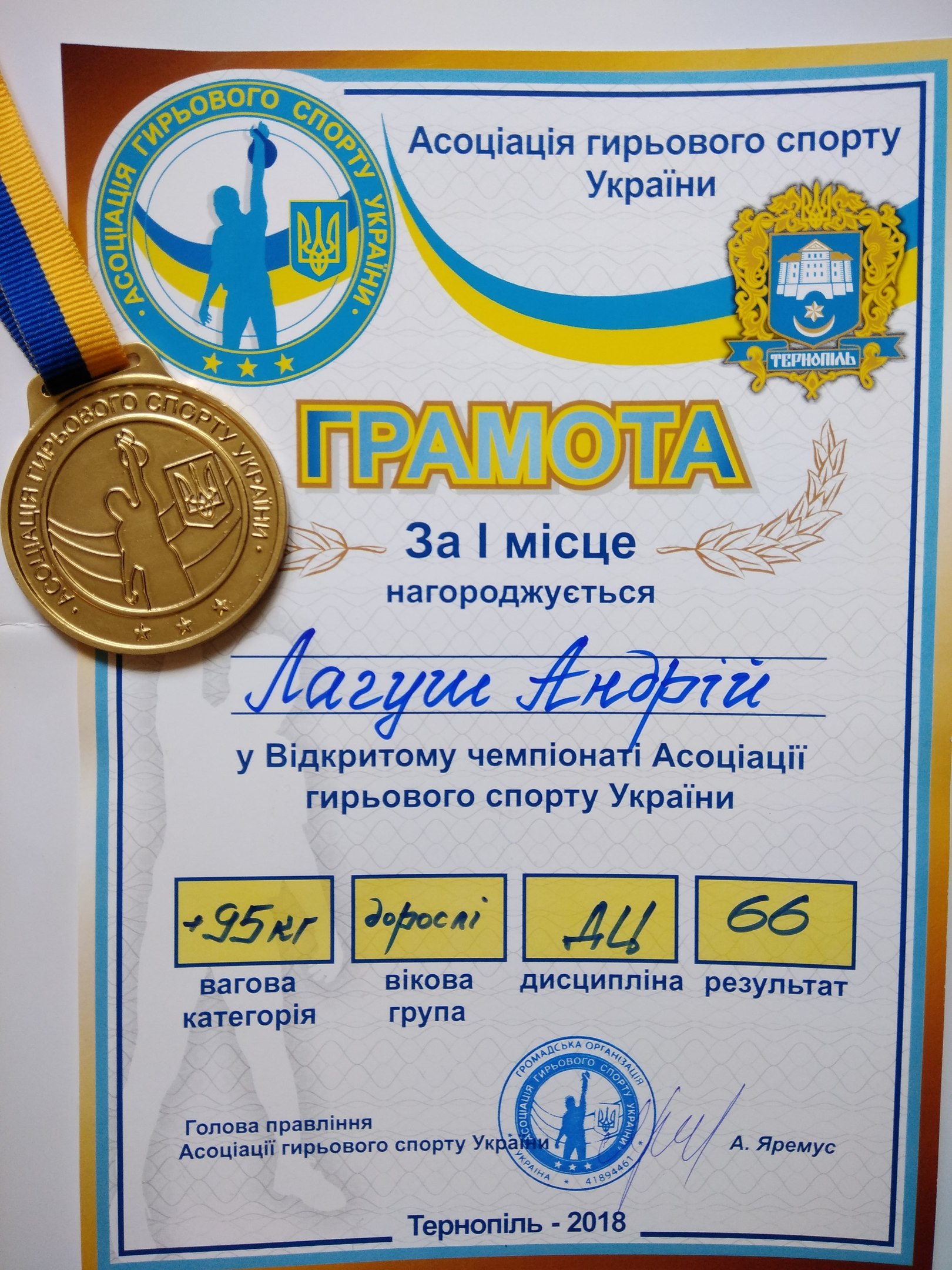 4 – 6 травня 2018 року в м. Тернопіль відбувся Відкритий чемпіонат Асоціації гирьового спорту України. Вітаємо студента ІІІ курсу інституту фізичної культури і здоров’я Андрія Лагуша, який посів І місце у довгому циклі (вагова категорія +95 кг) серед дорослих.