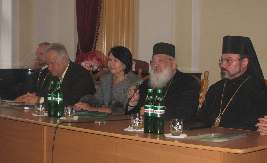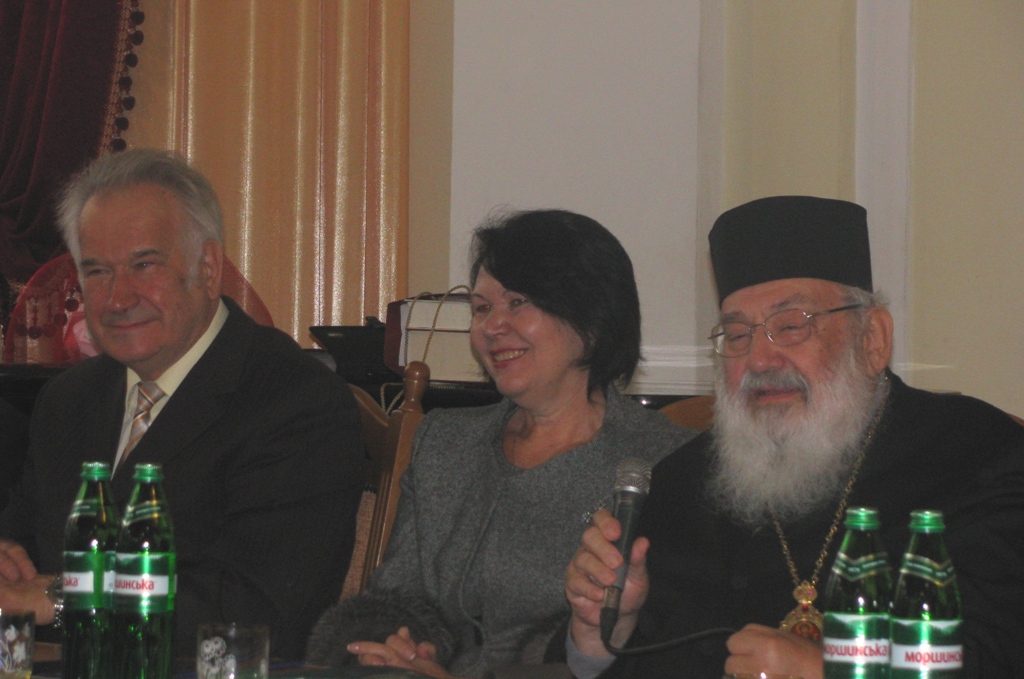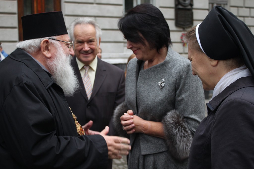 - На фото (зліва направо): владика Ярослав Приріз, заслужений професор університету Юрій Кишакевич, Блаженніший Любомир Гузар, ректор професор Надія Скотна, капелан університету о. Олег Кекош
