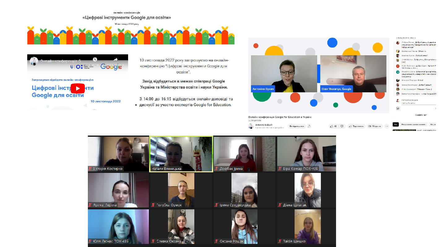 10 листопада 2022р. доц. Наталія Винницька та студенти 4 курсу факультету початкової освіти та мистецтв прийняли участь у онлайн-конференції «Цифрові інструменти Google для освіти», яка відбулась в межах співпраці Google Україна та Міністерства освіти і науки України, де брали активну участь у навчальних сесіях.