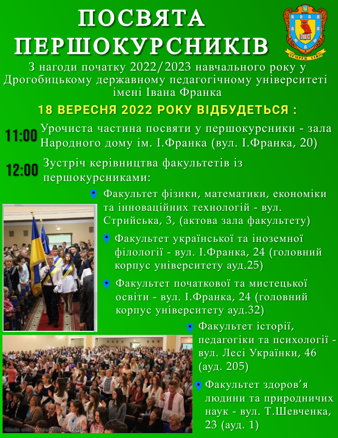Відповідно до наказу ректора № 296 від 09.09.2022 р. «Про проведення Урочистої посвяти першокурсників у студенти Дрогобицького державного педагогічного університету імені Івана Франка»