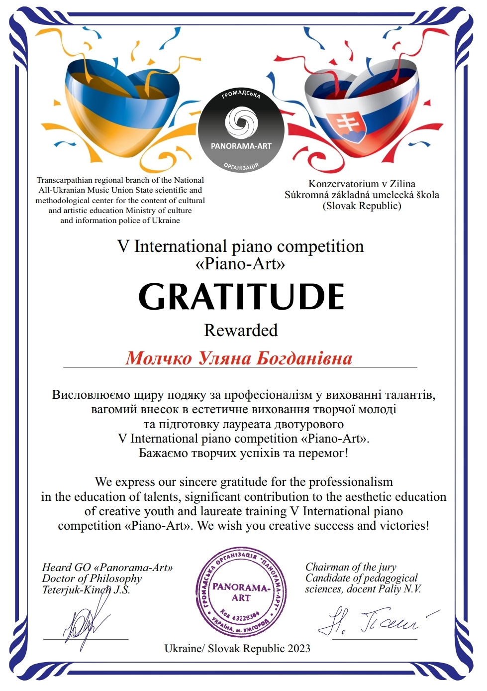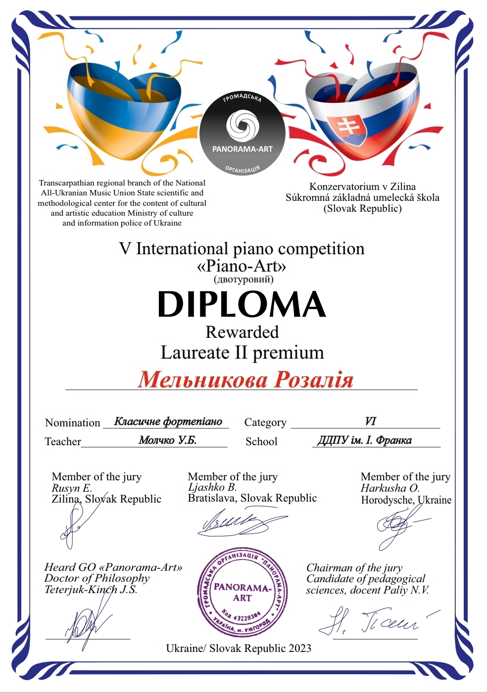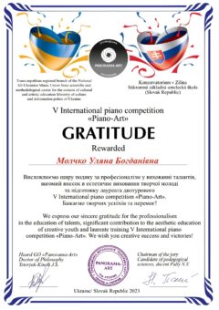 1 травня 2023 року завершився V International piano competition «Piano-Art» (Žilina, Slovak republic), на якому здобувачка освіти факультету початкової освіти та мистецтва Розалія Мельникова стала лауреаткою ІІ премії. Вдосконалюючи свою фахову майстерність в класі фортепіано доцентки Уляни Молчко, магістрантка показала свої значні музично-виконавські здобутки на міжнародному змаганні.