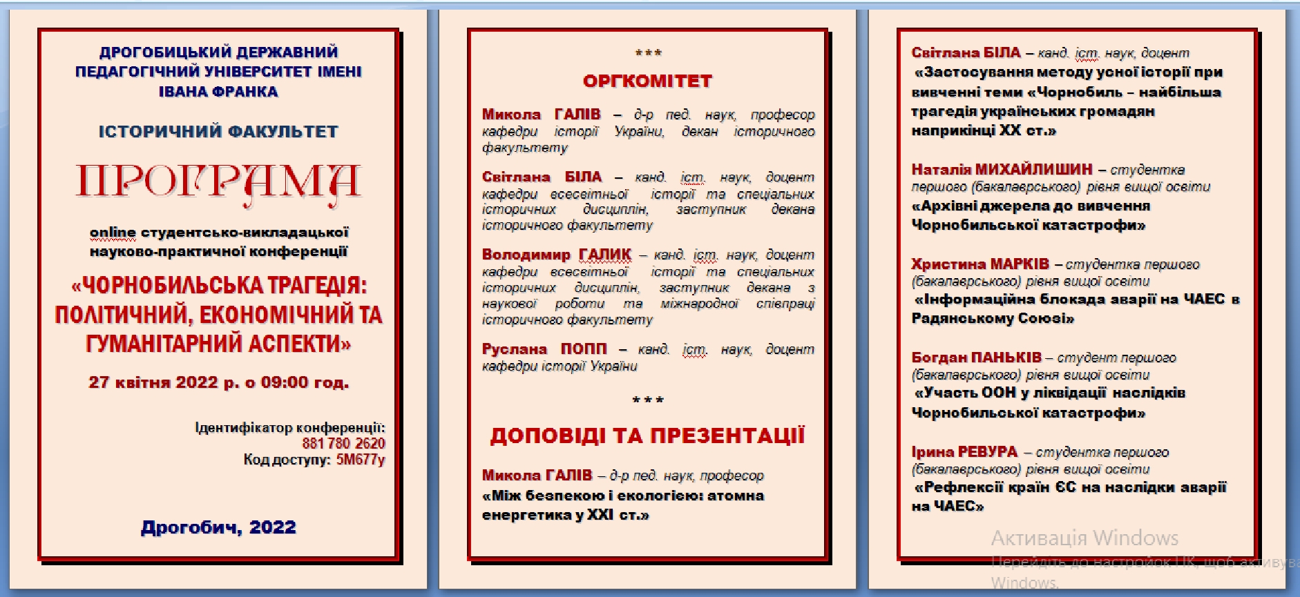 27 квітня 2022 р. на історичному факультеті Дрогобицького державного педагогічного університету імені Івана Франка у режимі онлайн відбулася студентсько-викладацька науково-практична конференція «Чорнобильська трагедія: політичний, економічний та гуманітарний аспекти». Відзначимо, що конференції на зазначену тематику на історичному факультеті відбуваються щороку і мають на меті вшанування пам’яті жертв Чорнобильської катастрофи.