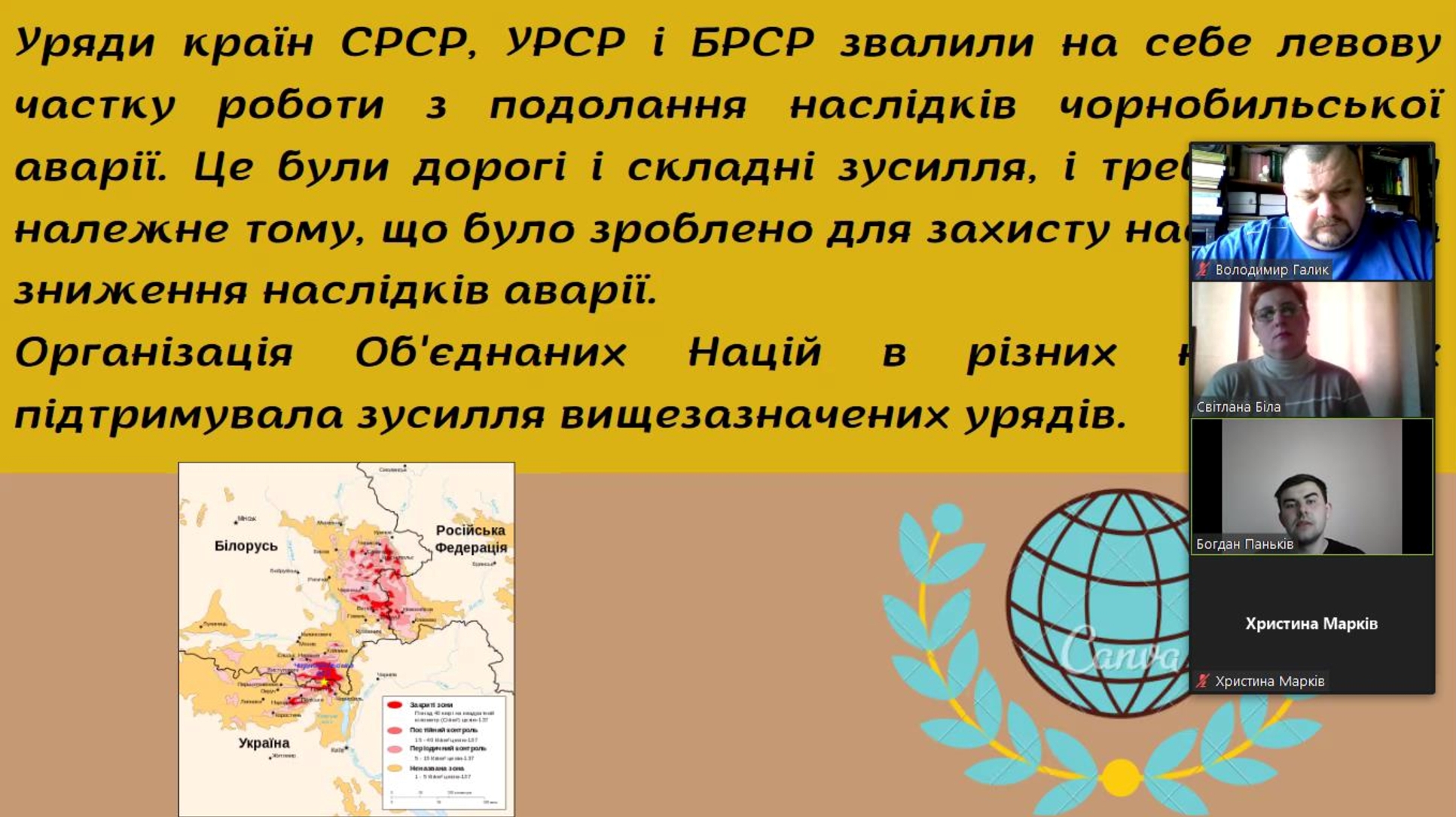 Доповіді-презентації студентів висвітлювали різні аспекти Чорнобильської катастрофи із політичних, економічних й гуманітарних питань. Зокрема, Наталія Михайлишин ознайомила учасників із переліком архівних джерел до вивчення Чорнобильської катастрофи; Христина Марків торкнулася проблеми інформаційної блокади аварії на ЧАЕС в Радянському Союзі; Богдан Паньків розлого охарактеризував безпосередній внесок ООН у ліквідацію наслідків Чорнобильської катастрофи; Ірина Ревура окреслила вибрані рефлексії представників країн ЄС щодо наслідків аварії на ЧАЕС; Христина Мецан проаналізувала співробітництво США і України у плані подолання наслідків аварії, а Мирослава Кітела – розповіла про особливості вшанування пам’яті Чорнобильської трагедії в Україні.