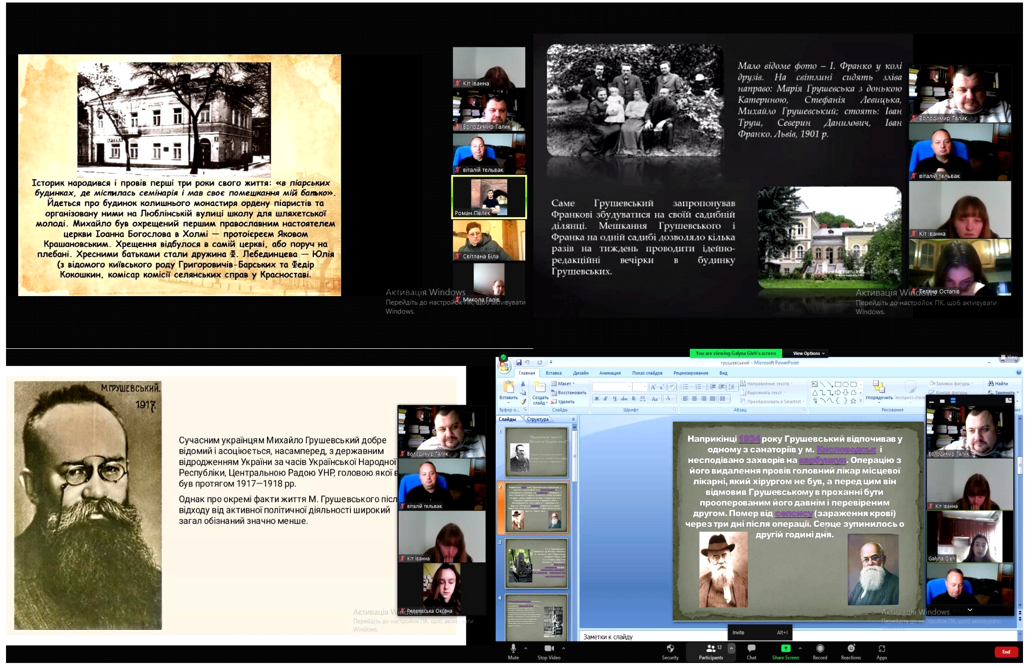 Доповіді, присвячені актуальним питанням сучасного грушевськознавства, виголосили науково-педагогічні працівники історичного факультету: професор Віталій Тельвак – «Рецепція суспільно-політичної діяльності Михайла Грушевського в історіографії кінця ХІХ – 80-х років ХХ століття»; професор Микола Галів – «Михайло Грушевський як історик освіти України»; доцентка Світлана Біла – «Михайло Грушевський на сторінках підручників з історії України»; доцент Володимир Галик – «Увіковічення пам’яті М. Грушевського на поштових та непоштових марках в Україні та за кордоном».