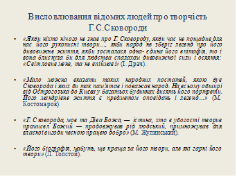 У середу 30 листопада 2022 року з нагоди 300-річчя з дня народження Григорія Сковороди на кафедрі англійської мови та перекладу відбувся круглий стіл на тему «Рецепція та інтерпретація літературної творчості Григорія Сковороди крізь призму наукових досліджень». У роботі круглого столу взяли участь викладачі кафедри. Доповідачка, кандидат філологічних наук, старший викладач кафедри Любов Сливка охарактеризувала основні мотиви творчості визначного філософа та поета та коротко ознайомила присутніх з рецепцією та інтерпретацією його творчості крізь призму наукових досліджень. Зокрема, доповідачка зазначила, що про життя та творчість Сковороди написано сотні історико-філософських, богословських, літературознавчих, лінгвістичних, педагогічних, музикознавчих та інших розвідок, його твори видавалися багато разів не лише в оригіналі, але й у численних перекладах, а сам він став знаковою фігурою для цілого грона блискучих письменників та інтелектуалістів: досить пригадати бодай Тараса Шевченка, Івана Франка, Льва Толстого, Олександра Потебню, Володимира Соловйова, Володимира Ерна, Миколу Сумцова, Дмитра Багалія, Михайла Грушевського, Сергія Єфремова, Миколу Бердяєва, Олексія Лосєва, Миколу Зерова, Миколу Хвильового, Павла Тичину, Михайла Булгакова, Дмитра Донцова, Івана Мірчука, Дмитра Чижевського, Георгія Флоровського, Юрія Лотмана, Юрія Шевельова, Ришарда Лужного, Богдана Гаврилишина, Роланда Піча, Сергія Аверинцева, Івана Павла ІІ чи Пауло Коельо. Викладачі кафедри активно долучились до обговорення рецепції та інтерпретації творчості Григорія Сковороди, зокрема, дослідили та коротко проаналізували розвідки над діяльністю Г.Сковороди як перекладача. Слід зазначити, що пророче передбачаючи майбуття, а в ньому долю свого народу, великий письменник і філософ – писав: «Ми створимо світ кращий. В майбутній Україні бачу все нове: нових людей, нове творіння і нову славу». Можливо, ми українці ХХІ століття, є тими людьми, які творять нашу нову славу, нашої оновленої землі, на цій землі завжди житиме в серцях вдячних правнуків легендарний любомудр, наша гордість і слава – Григорій Сковорода.