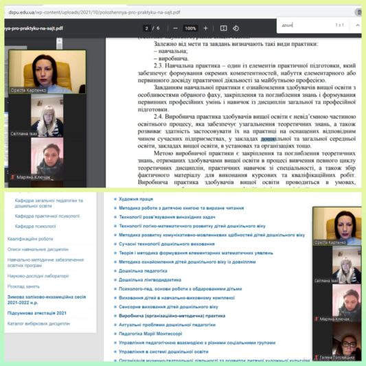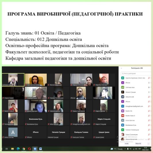 9 лютого 2022 року відбулася настановча нарада з питань організації та проведення виробничої (педагогічної) практики для студентів ІІ курсу другого (магістерського) рівня вищої освіти факультету психології, педагогіки та соціальної роботи спеціальності 012 “Дошкільна освіта”.