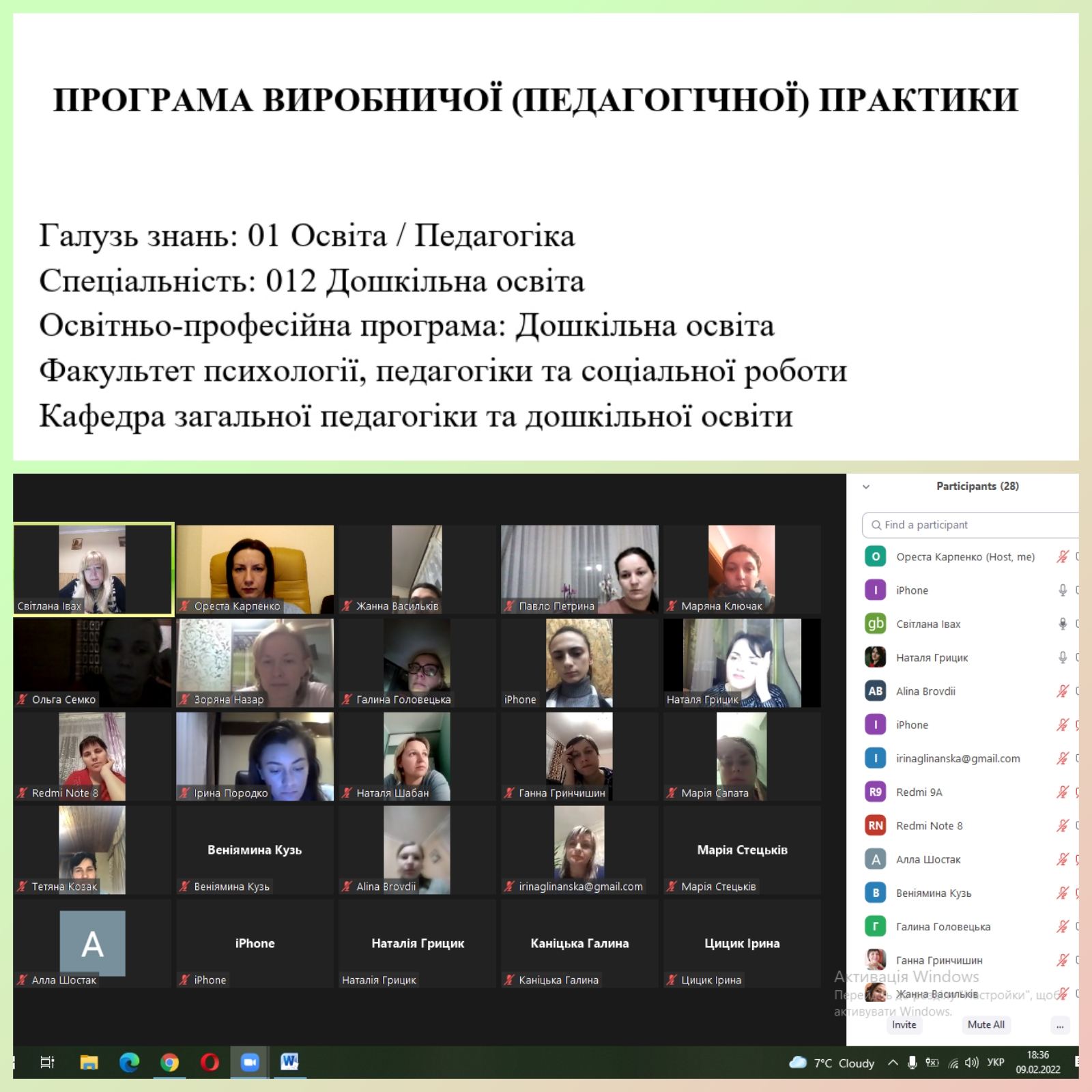 У нараді взяли участь: факультетська керівниця практики доцентка Світлана Івах, методистка від кафедри загальної педагогіки та дошкільної освіти професорка Ореста Карпенко, студенти магістратури денної і заочної форм здобуття освіти.