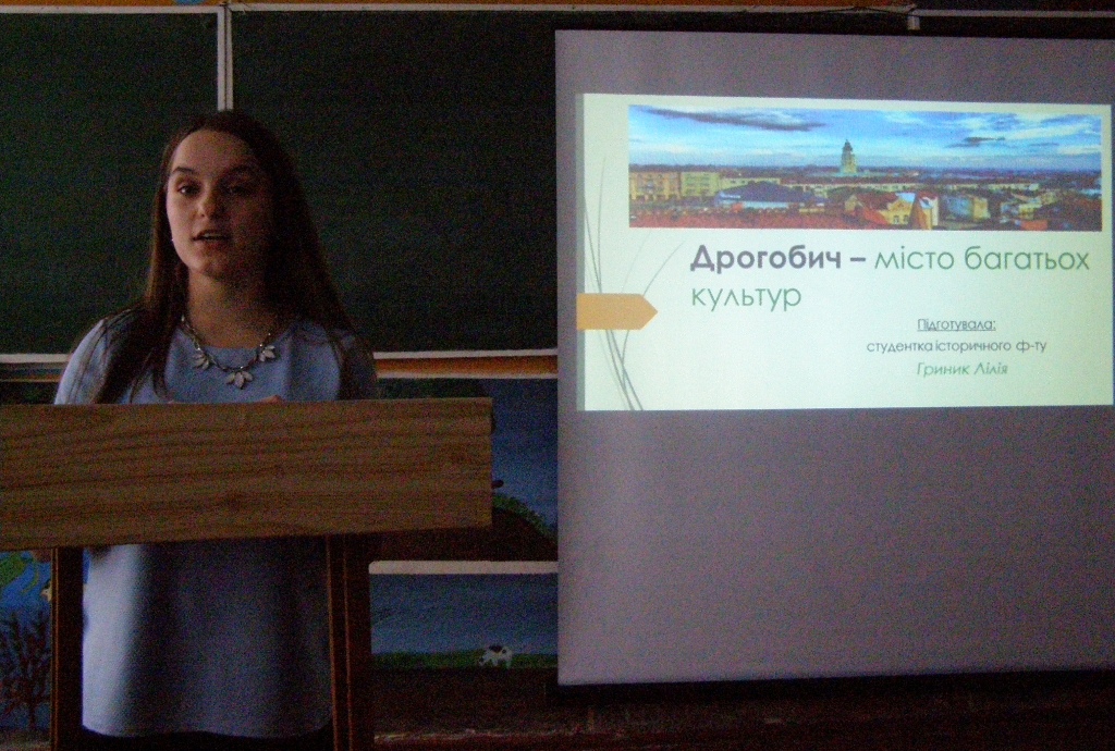 Велике зацікавлення учнів викликали презентації студентів історичного факультету, присвячені таким темам: «Борислав – «Галицька Каліфорнія» (Лідія Мазурчак, гр. ІП-21Б), «Перлина Карпат – м. Трускавець» (Аліна Звіринська, гр. ІП-31Б), «Дрогобич – місто багатьох культур» (Лілія Гриник, ІП-31Б). Відео-презентацію історичного факультету провів студент групи ІП-31Б Остап Зубкович.