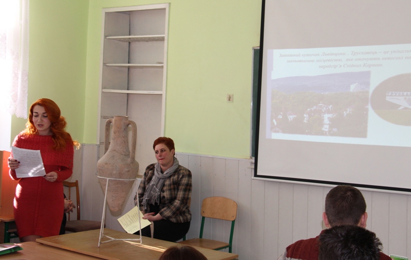 - Студентка Аліна Звіринська ознайомлює учнів з історією міста Трускавець