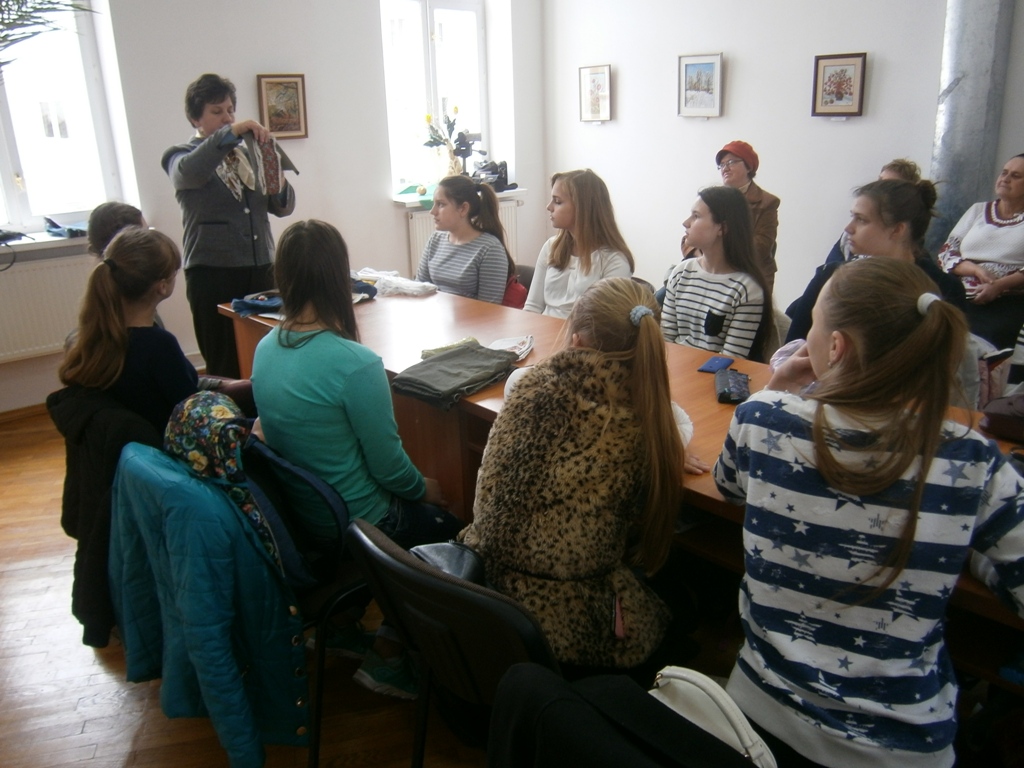 - Студентка Ліля Псарук демонструє учням сумку-клатч декорований бойківською вишивкою