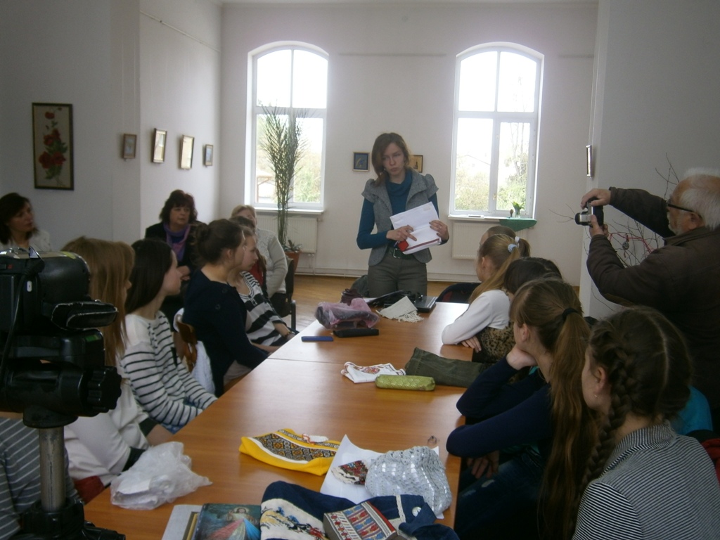 Присутні мали змогу власноруч виготовити під керівництвом доцента Н. Кузан та Л. Псарук на майстер-класі сучасні сумки-клатчі з джинсу оздоблені зразками старовинних вишивок шнурами та бісером.