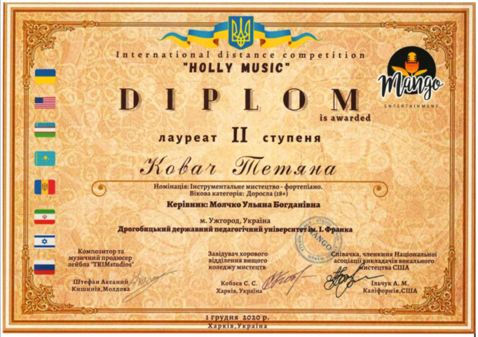 1 грудня 2020 року в місті Харків відбувся Міжнародний музичний конкурс “Holly music”, на якому лауреаткою ІІ ступеня в номінації «Інструментальна музика», стала магістерка інституту музичного мистецтва Тетяна Ковач. Своє професійне становлення вона пройшла в класі доцентки кафедри музикознавства та фортепіано Уляни Молчко. Фортепіанну майстерність від цієї знаної педагогині перейняло чимало піаністів-лауреатів музичних змагань різного рівня.