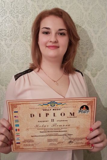 На Міжнародному конкурсі “Holly music” в м. Харків студентка заочної форми навчання Тетяна Ковач на розгляд фахового журі представила програму з творів українських композиторів Віктора Косенка, Василя Барвінського, Нестора Нижанківського, Миколи Колесси. Блискучий технічний рівень, тонке фразування, багата звукова палітра вирізняли її серед піаністів-конкурсантів із Польщі, Угорщини, Румунії, Канади, Молдови, Росії.