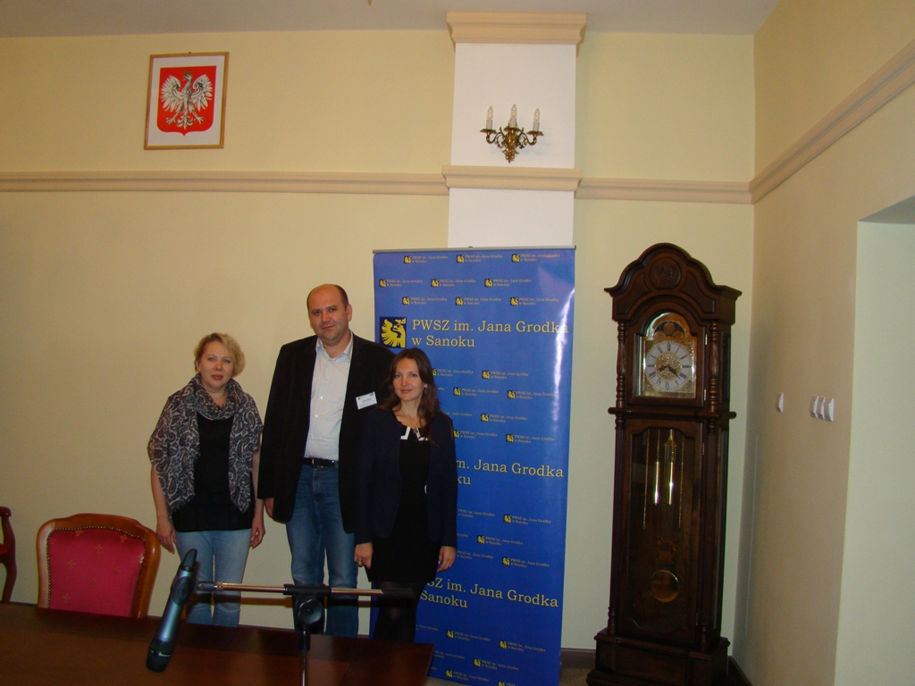 - У сенатській залі Державної вищої професійної школи ім. Яна Ґродка у Саноку (зліва направо): Віра Меньок, Павло Скотний, Оксана Рибак – докторантка Львівського національного університету ім. Івана Франка