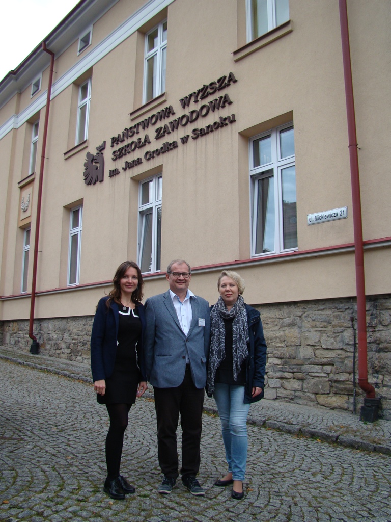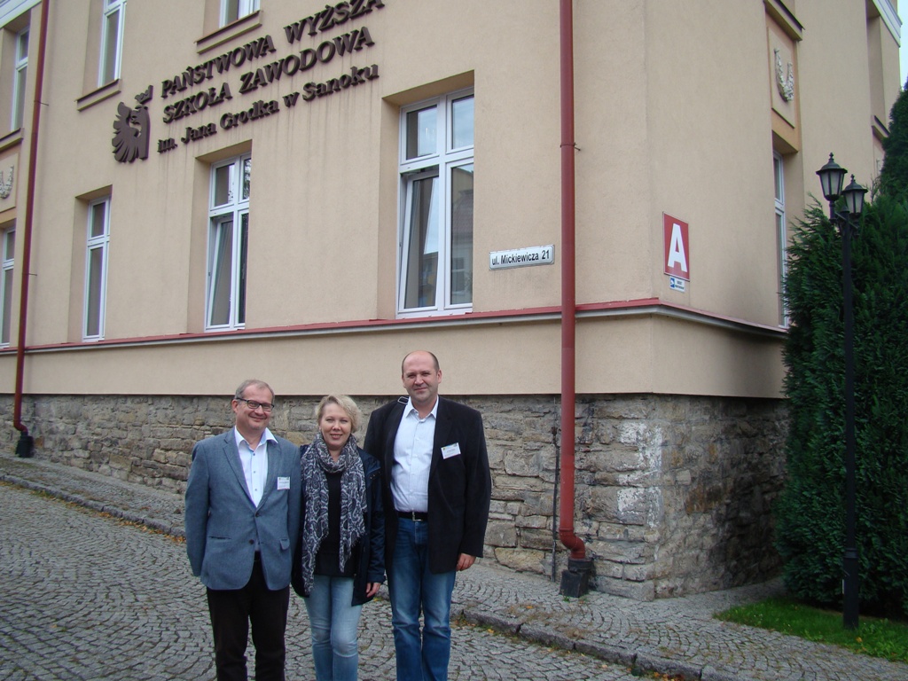 На подвір’ї Державної вищої професійної школи ім. Яна Ґродка у Саноку: Оксана Рибак, професор Даріуш Вояковський (Жешівський університет), Віра Меньок, Павло Скотний