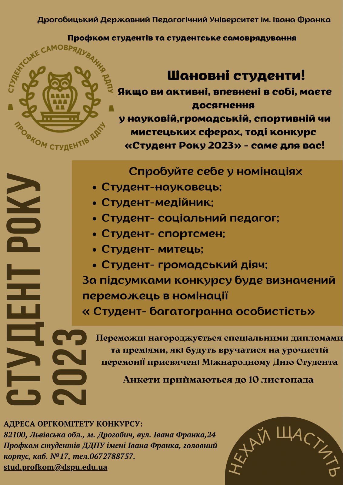 Профком студентів ДДПУ імені Івана Франка, головний корпус, каб. №17, тел.0672788757.