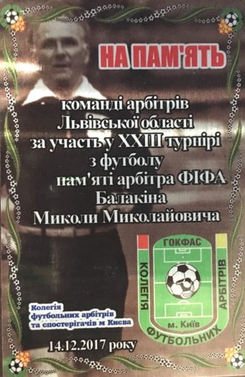 14 грудня 2017 року в Києві відбувся традиційний щорічний турнір, присвячений пам’яті найпершого вітчизняного арбітра ФІФА Миколи Балакіна.