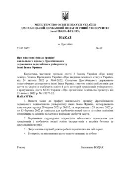 Керуючись частиною третьою статті 2 Закону України «Про вищу освіту», Указом Президента України «Про введення воєнного стану в Україні» від 24 лютого 2022 р. №64/2022, Статутом Дрогобицького державного педагогічного університету імені Івана Франка, з метою мінімізації ризиків для життя та здоров’я здобувачів освіти й усіх категорій працівників університету, з врахуванням листа МОН України «Про організацію освітнього процесу» від 25 лютого 2022 р. № 1/3277-22, запроваджено з 28 лютого 2022 р. по 13 березня 2022 р. канікули для здобувачів вищої освіти за усіма освітніми програмами за денною та заочною формами здобуття освіти.