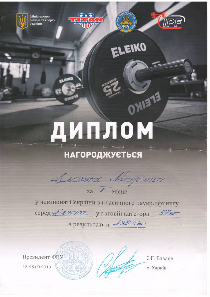 18 – 28 вересня 2019 року у м. Харків відбувся чемпіонат України з класичного пауерліфтингу. Студентка ІІ курсу інституту фізичної культури і здоров`я Мар’яна Дьорка в сумі триборства здобула срібну нагороду (присідання – ІІ місце, жим лежачи – І місце, станова тяга І місце).