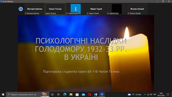 Студенти підготували цікаві доповіді у формі презентацій: Вікторія Бублик «Голодомор в Україні (1932–1933 рр.): загальні аспекти»; Тетяна Чапля «Психологічні наслідки голодомору 1932–33 рр. в Україні»; Діана Давидова «Голодомор і його наслідки та вплив на здоров’я і життя людей»; Іванна Ханас «День пам’яті жертв Голодомору»; Віталій Легкий «Голодомор в Україні 1932–1933 рр.: юридичні аспекти»; Марія Туряб «Запровадження натуральних штрафів, чорних дощок, блокада УРСР»; Юлія Пидляк «Голодомор 1932–1933 років в Україні: демографічні втрати».