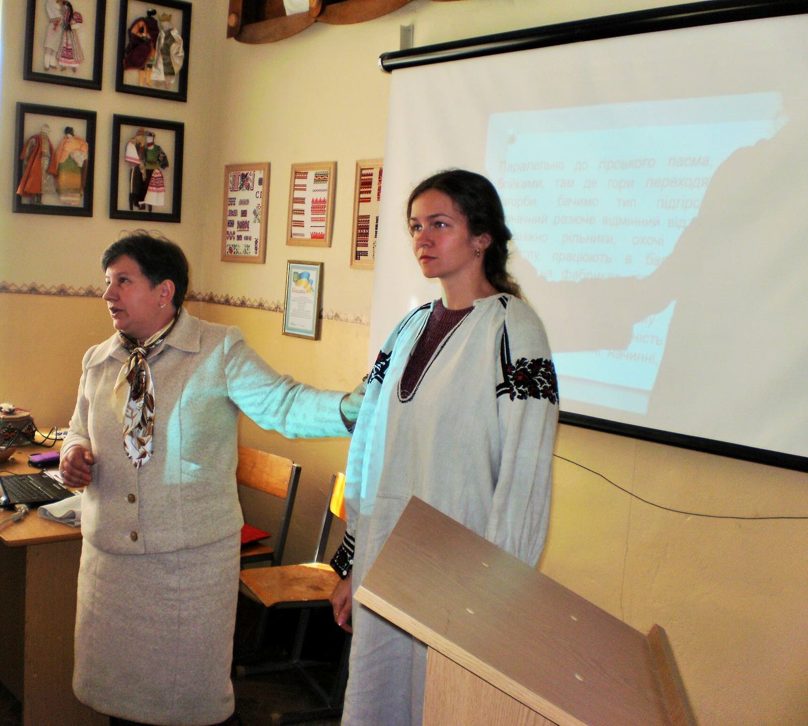 Керівник лабораторії «Мистецька Бойківщина» Надія Кузан ознайомила вчителів із локальними особливостями та відмінностями бойківського народного костюма. Щоб відчути особливості крою бойківських сорочок, учасники семінару приміряли сорочки Дрогобицького та Старосамбірського повітів.