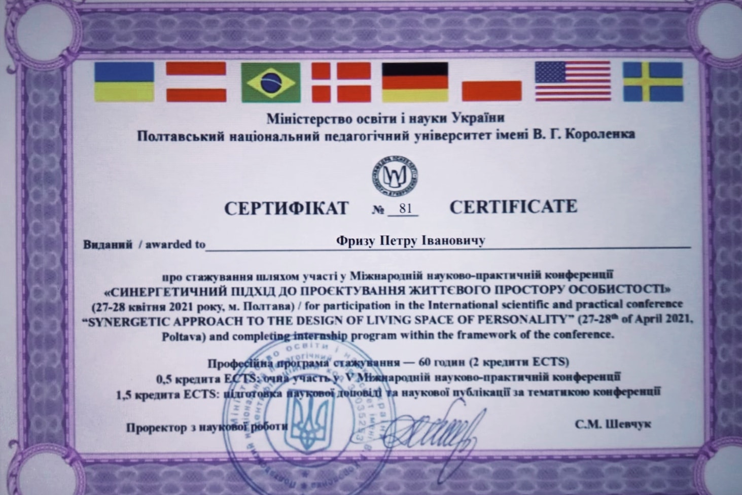 27 – 28 квітня 2021 року доцент кафедри культурології та мистецької освіти Петро Фриз пройшов стажування шляхом участі у Міжнародній науково-практичній конференції «Синергетичний підхід до проєктування життєвого простору особистості», яка відбулася в Полтавcькому національному педагогічному університеті імені В.Г. Короленка (професійна програма стажування – 60 годин (2 кредити ЕCTS: 0,5 кредиту ЕCTS – очна участь у V Міжнародній науково-практичній конференції; 1,5 кредиту ЕCTS – підготовка наукової доповіді та наукової публікації за тематикою конференції)).