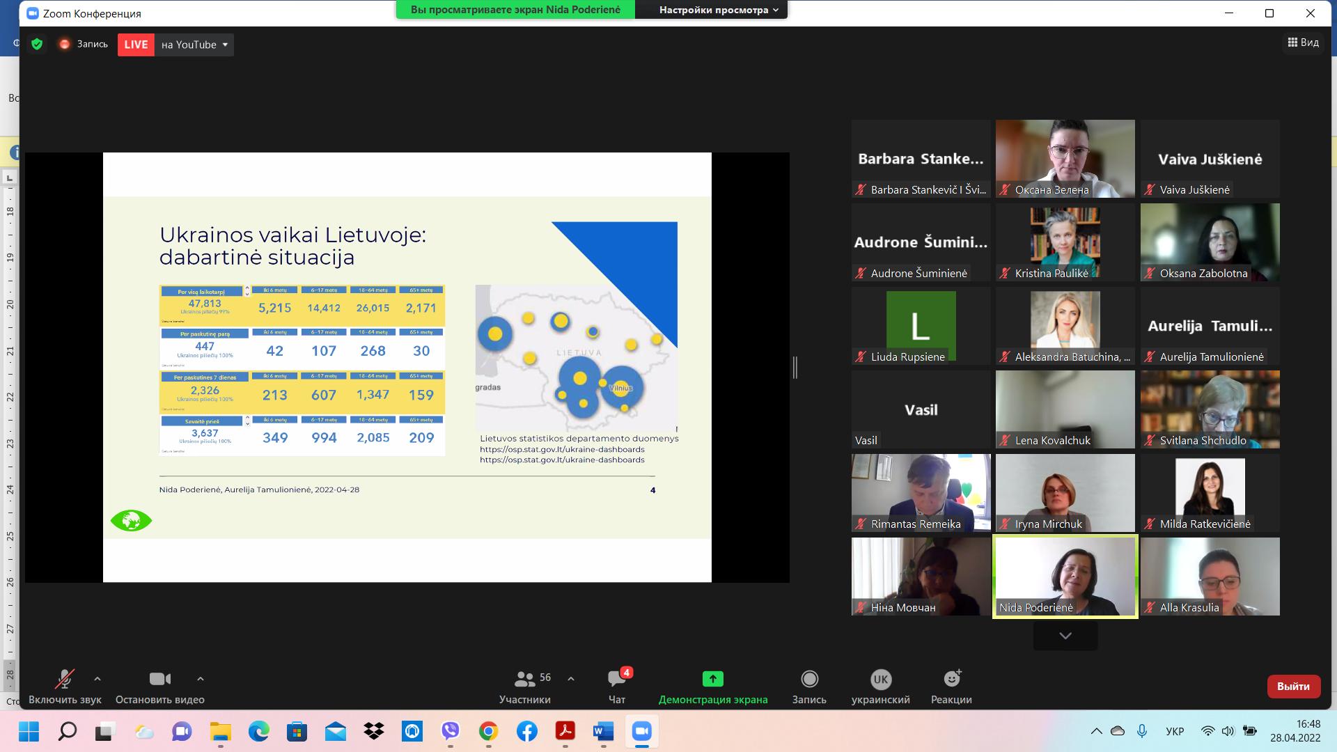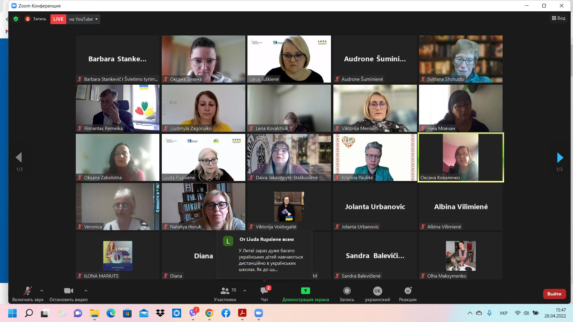 Модерували захід докторка Вайва Юшкене, декан педагогічного факультету Вільнюського коледжу, членкиня правління Асоціації освітніх досліджень Литви, і радниця відділу загальної освіти департаменту фундаментальної та середньої освіти Аудронe Шумінієнe. У центрі уваги були результати досліджень інтеграції українських учнів у систему освіти Литви. З українського боку виступила президентка Української асоціації дослідників освіти професорка Оксана Заболотна.