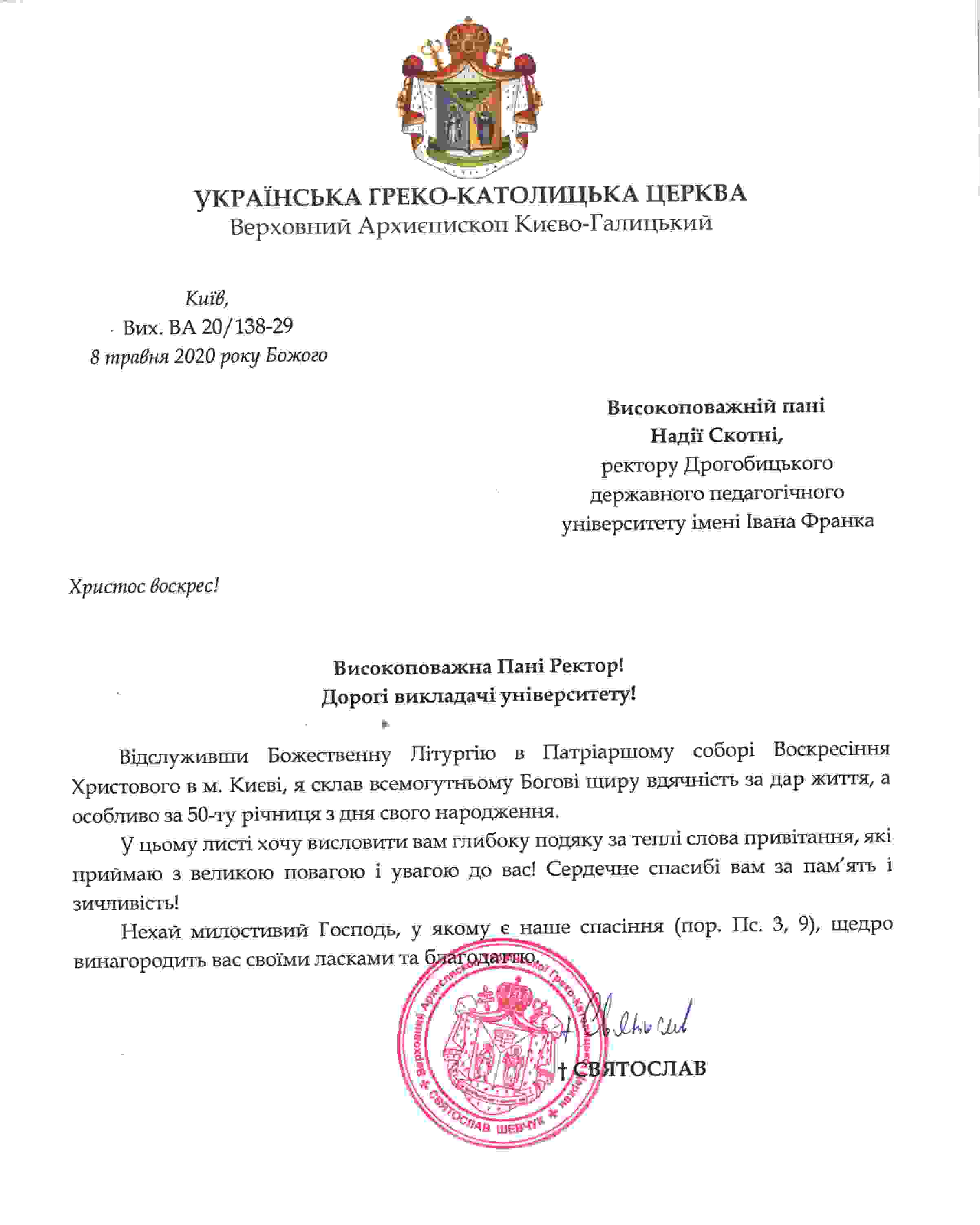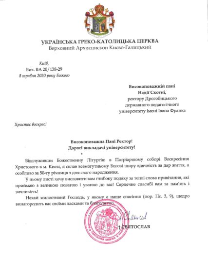 20 травня на адресу Франкового університету надійшов лист від Блаженнішого Святослава, який висловлює глибоку подяку за теплі слова привітання й уділяє навзаєм ректорові та усім викладачам своє патріарше благословення.