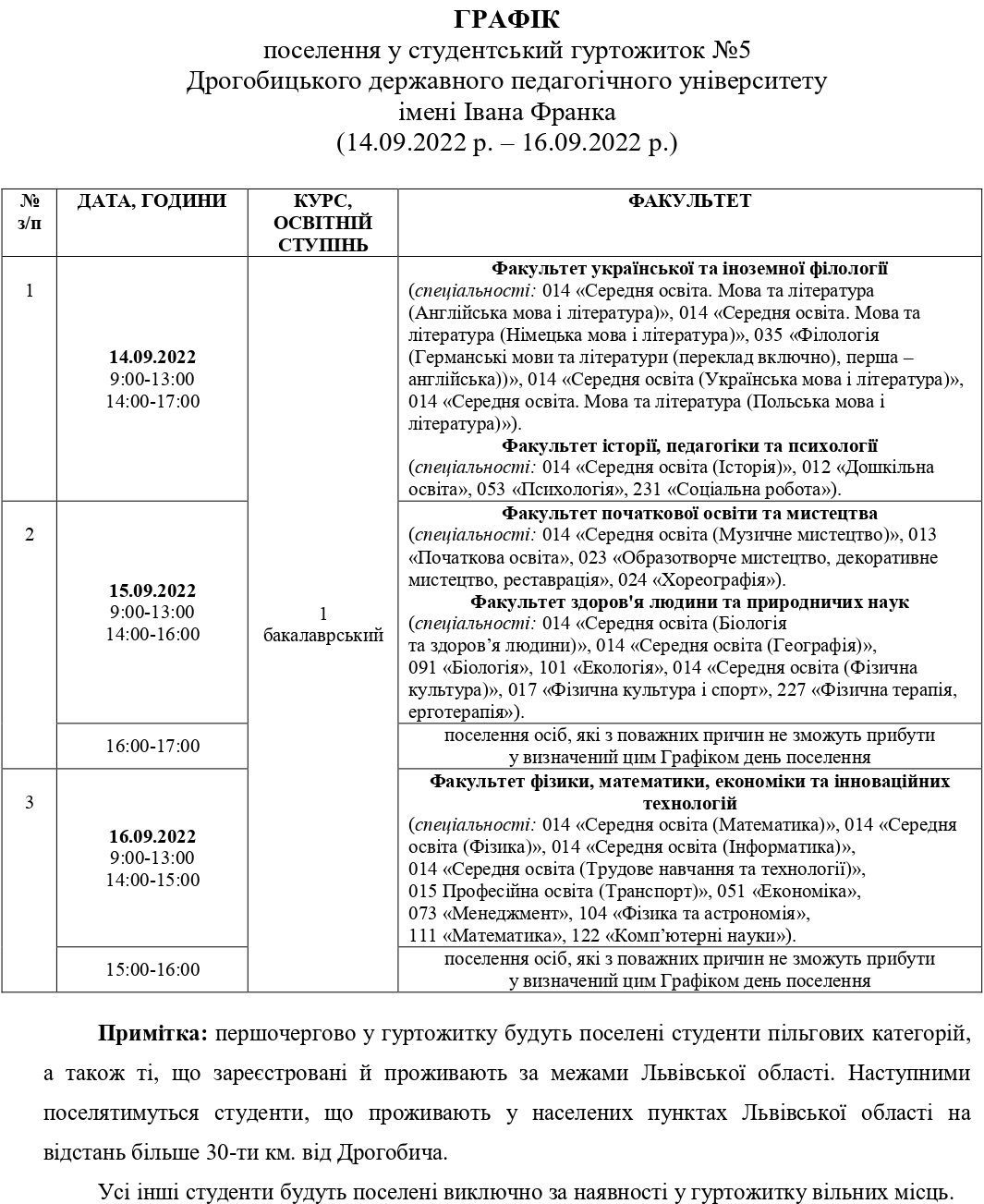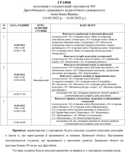 14 вересня з 9:00 год. розпочинається поселення студентів-першокурсників (бакалавр) у студентський гуртожиток відповідно до графіку.