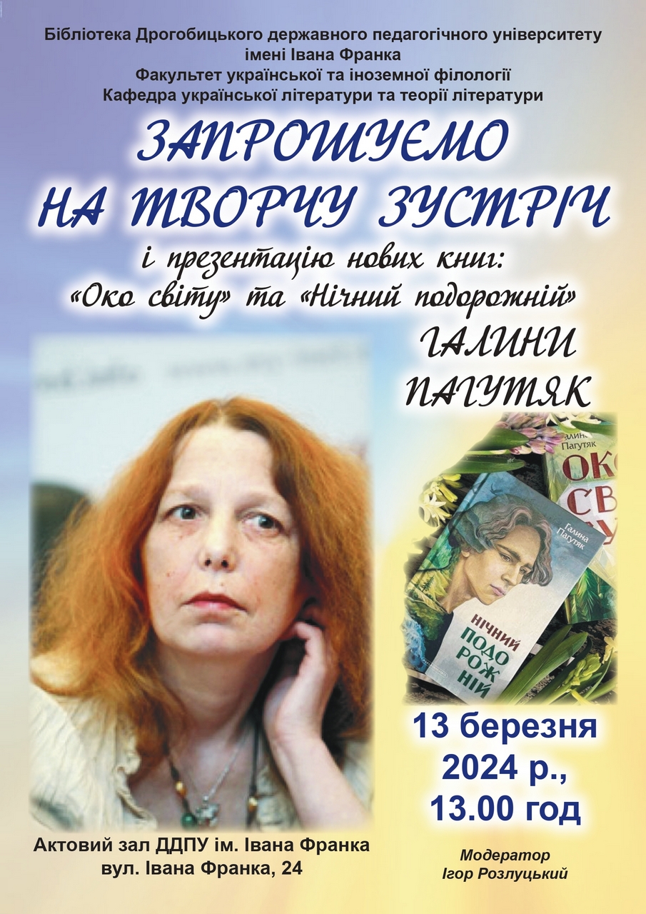 У середу, 13 березня, о 13.00 год. в актовій залі університету відбудеться творча зустріч з письменницею Галиною Пагутяк.