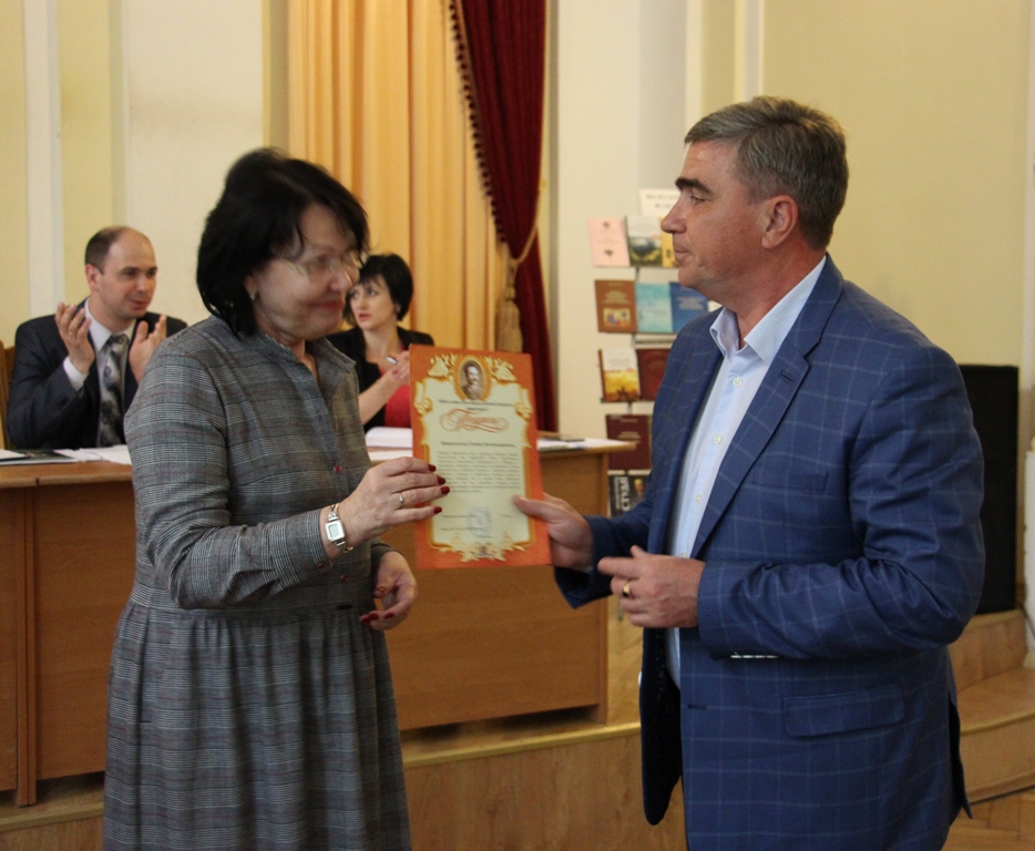 - Ректор професор надія Скотна вручає відзнаку професору Леоніду Оршанському