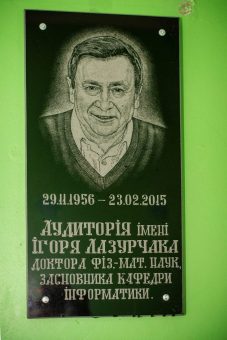 Вечір розпочався з церемонії відкриття меморіальної дошки засновнику кафедри інформатики та обчислювальної математики, незмінним керівником якої був багато років. З ініціативи колективу кафедри і за підтримки вченої ради ІФМЕІТ комп’ютерному класу №1 (аудиторія №27) присвоєно ім’я доктора фізико-математичних наук Ігоря Лазурчака. Слово на пошану пам’яті ювіляра виголосили ректор університету професор Надія Скотна та завідувач кафедри інформатики та ОМ, доцент Оксана Сікора. Капелан університету отець Олег Кекош освятив пам’ятну дошку.