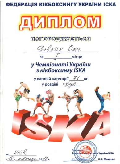 16 – 19 листопада 2017 року в місті Київ відбувся Чемпіонат України з кікбоксингу за версією ISKA, де брали участь найкращі кікбоксери з усієї України. У складі команди Львівської області серед дорослих взяв участь студент інституту фізичної культури і здоров`я, майстер спорту України Олег Павляк. Провівши чотири поєдинки, у кожному з яких здобув перемогу над представниками Києва, Харкова та Черкас, він виборов звання Чемпіона України з кікбоксингу за версією ISKA.