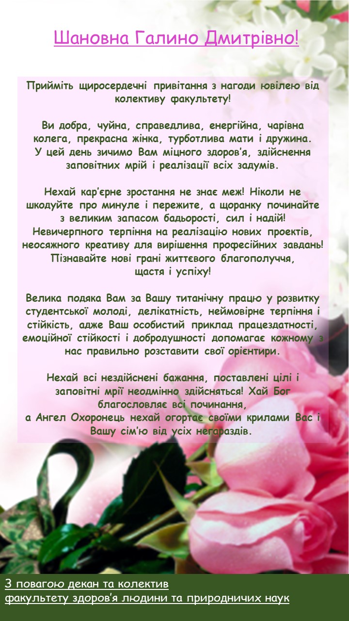 Колектив факультету здоров’я людини та природничих наук сердечно вітає Вас, шановна Галино Дмитрівно, з ювілеєм. Бажаємо міцного здоров’я, добра та миру.