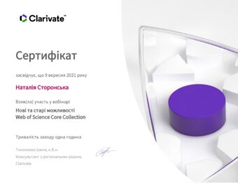 9 вересня 2021 року на платформі WEBEX відбувся вебінар «Нові та старі можливості Web of Science Core Collection», в якому взяла участь доцентка кафедри народних музичних інструментів та вокалу інституту музичного мистецтва Наталія Сторонська.