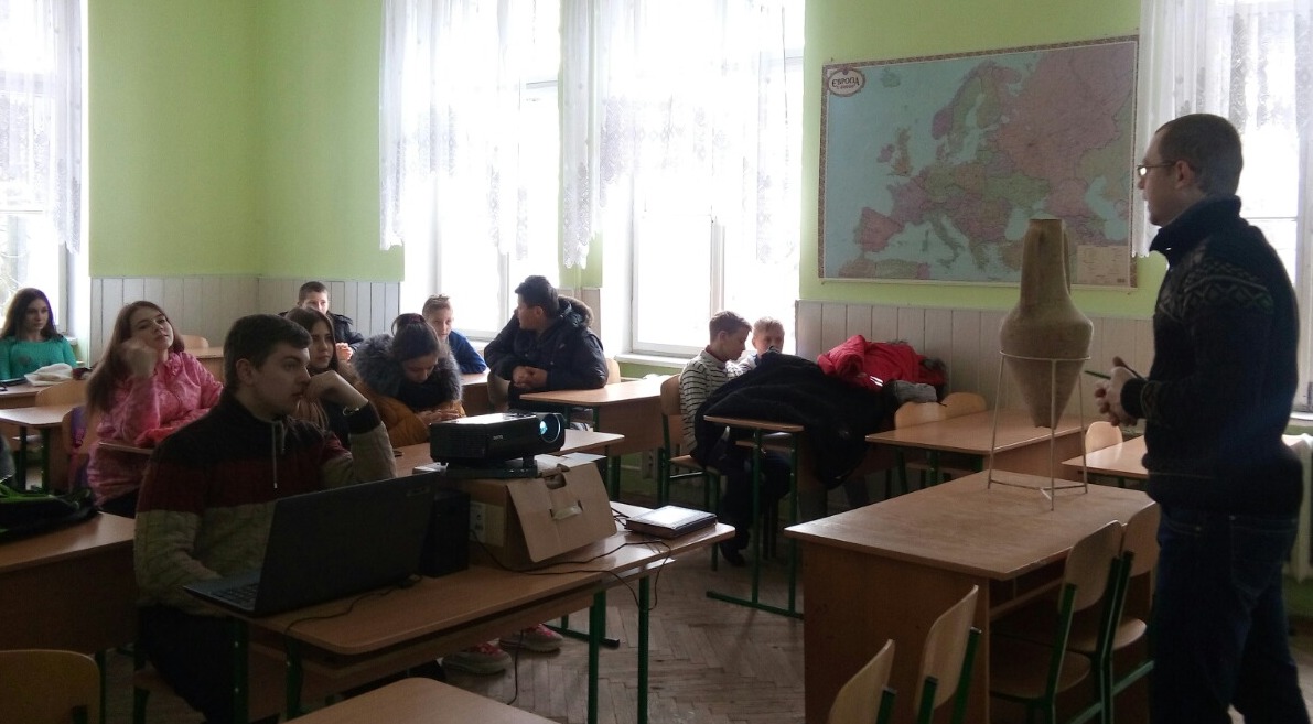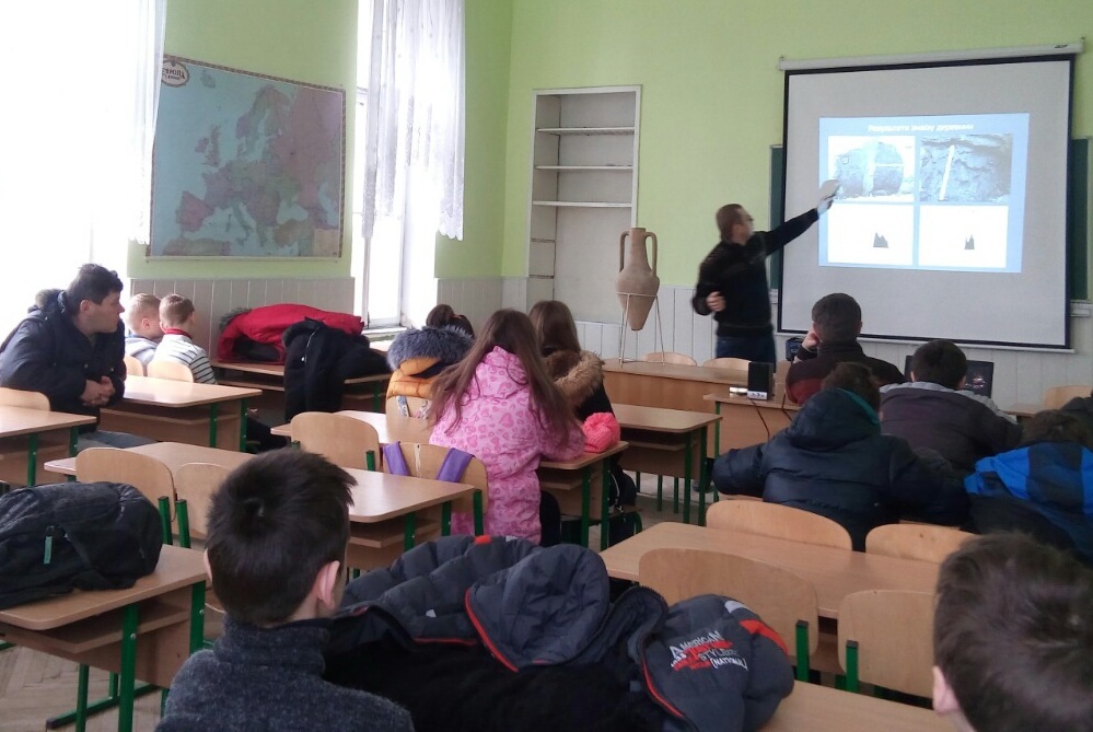 Згодом учні прослухали лекцію-презентацію про археологічні дослідження історичного факультету, яку провів викладач кафедри давньої історії України та спеціальних історичних дисциплін Василь Менько.