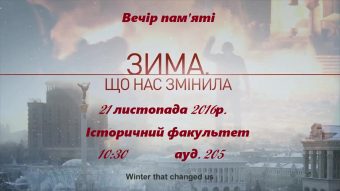21 листопада 2016 року на історичному факультеті відбувся вечір пам’яті „Зима, що нас змінила”, який присвячений третій річниці Революції Гідності та світлої пам’яті героям Небесної Сотні. До присутніх звернулися доцент Світлана Біла, професор Василь Футала та учасник АТО Тарас Савшак.