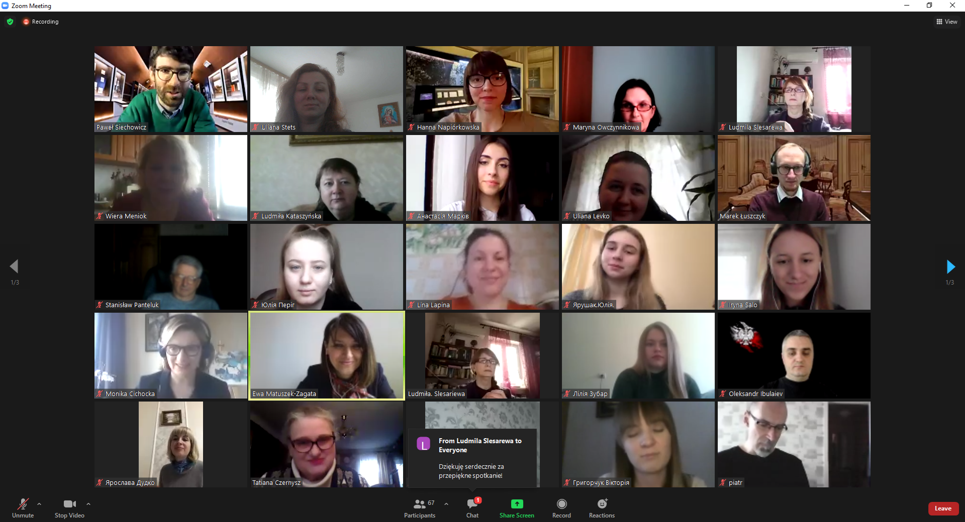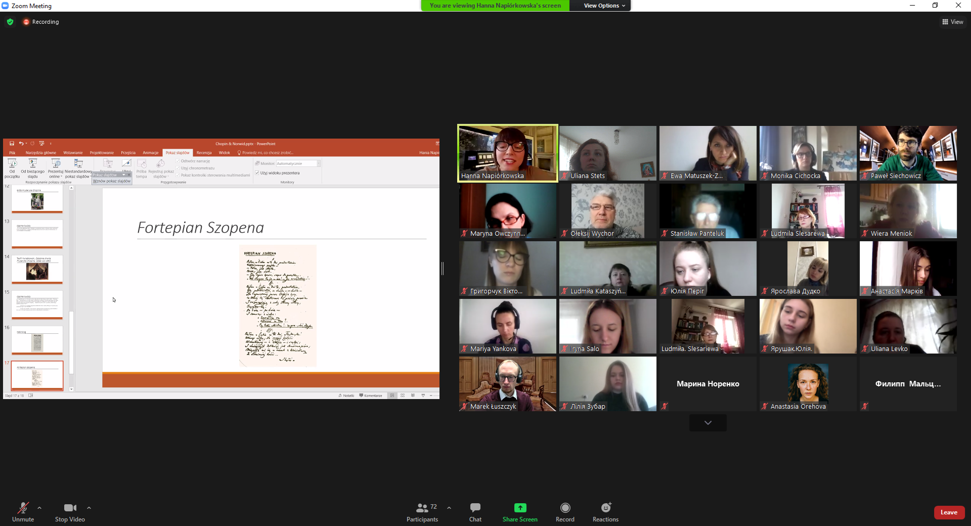 19) На запрошення Посольства Республіки Польща 17 квітня 2021 року відбулася тематична онлайн-зустріч у Клубі вчителів польської мови, що діє при Посольстві, в якій взяли участь студентки та маґістрантки польської філології філологічного факультету нашого університету. Темою зустрічі стала творчість та еміґрантська доля видатних польських митців – композитора світової слави Фридерика Шопена та геніального поета Ципріяна Каміля Норвіда. У ґроні викладачів та вчителів польської мови з усієї України наші студентки мали особливу нагоду збагатити свої знання з польської літератури та культури, довідатись багато цікавого завдяки професійним розповідям та презентаціям наукових працівників польського Національного Інституту Фридерика Шопена – доктора Павла Сєховича, Ганни Нап’юрковської та Марека Лущика.