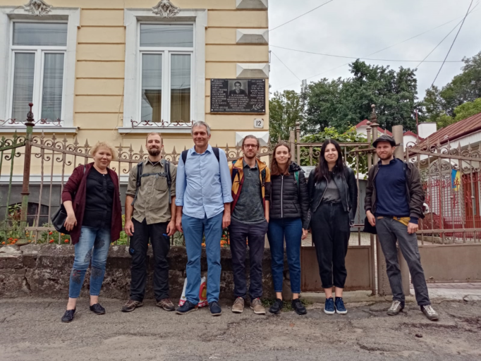 - Учасники проєкту біля будинку Бруно Шульца, зліва направо: Віра Меньок, Крістоф Майш, Лотар Кінкенштайн, Лукас Фоґель, Александра Бацлавська, Міхаліна Пшекурат, Йоганн Віде