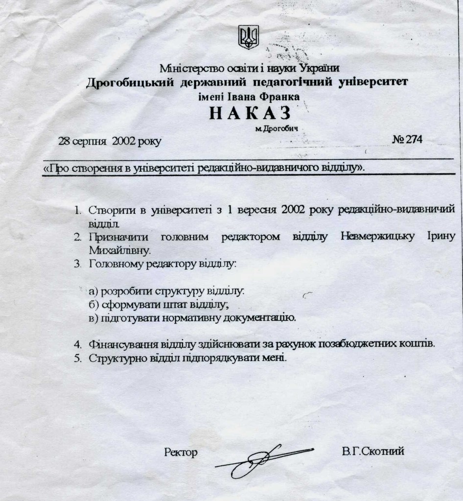 - Наказ «Про створення в університеті редакційно-видавничого відділу»