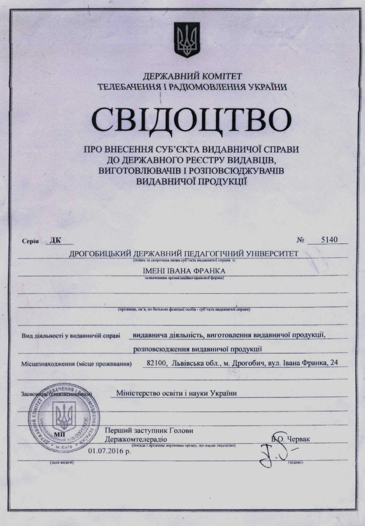 - Свідоцтво «Про внесення суб’єкта видавничої справи до державного реєстру видавців, виготовлювачів і розповсюджувачів видавничої продукції»