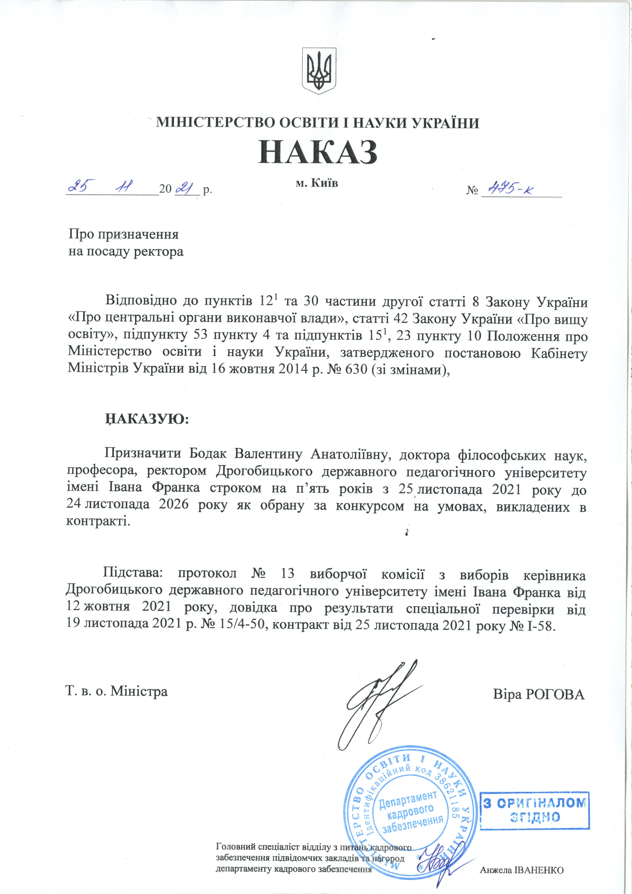 Лист МОН України Про проведення виборів ректора Дрогобицького державного педагогічного університету імені Івана Франка